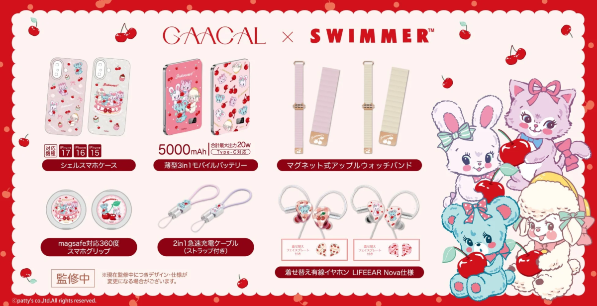 The collaboration’s theme centers on SWIMMER’s iconic “Cherry” motif, a design cherished across generations. This nostalgic design has been integrated into GAACAL’s lifestyle accessories, aiming to bring a sense of comforting cuteness to everyday routines.