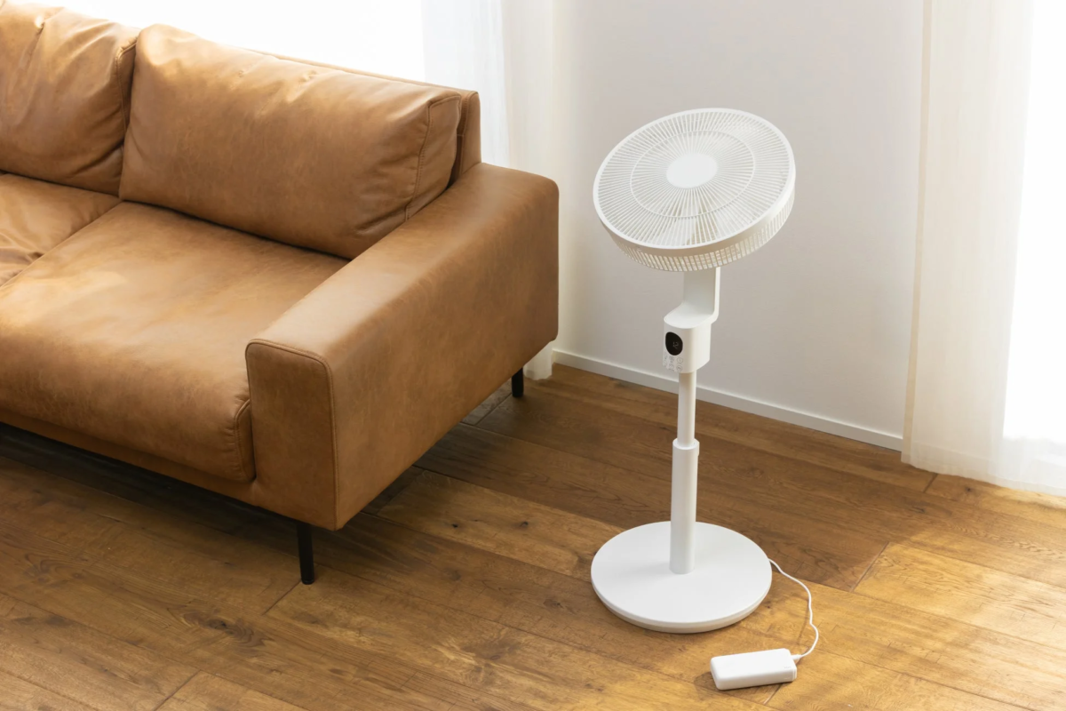 When used with a PD-compatible mobile battery (20,000mAh, sold separately), the fan can operate for up to approximately 80 hours on its lowest setting, even in locations without an AC outlet. Despite offering a full range of features including 12 levels of airflow adjustment, 4 levels of oscillation angle adjustment, and full remote control, the unit weighs only 2.3kg. This design proposes a new form of fan that can be comfortably used anywhere in the home, free from the constraints of power outlet locations.