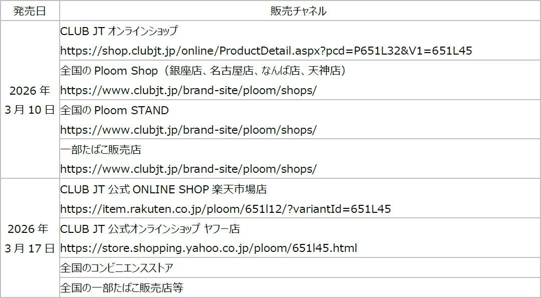 The “Ploom AURA Starter Kit Fuchsia Flare” will be sequentially released in limited quantities from March 10, 2026, at the CLUB JT Online Shop and Ploom Shops nationwide. It will then be released sequentially from March 17, 2026, at convenience stores and select tobacco retailers nationwide.