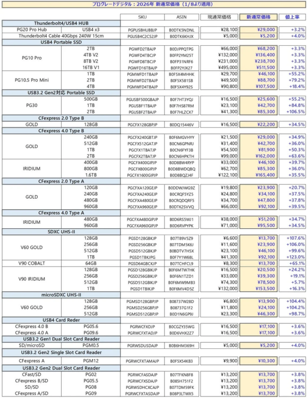 ProGrade Digital Inc. has announced that it will raise the standard prices of its products sold on the Amazon.co.jp ProGrade Digital Inc. store, effective January 8, 2026. This decision comes in response to a substantial increase in flash memory prices, which has been influenced by a surge in demand for semiconductor memory components critical for the construction of AI infrastructure.